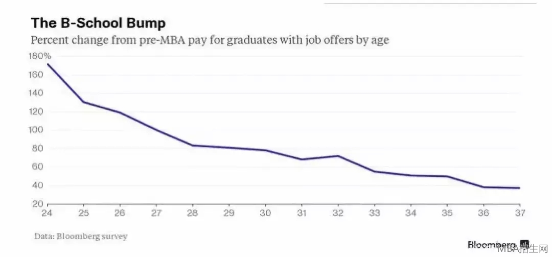 從上圖可以得出,隨著年齡的增長MBA畢業生薪水的增幅也在下降。圖中還能看出36歲和25歲的MBA畢業生的薪水比入學前分別能夠增長約47%和130%。