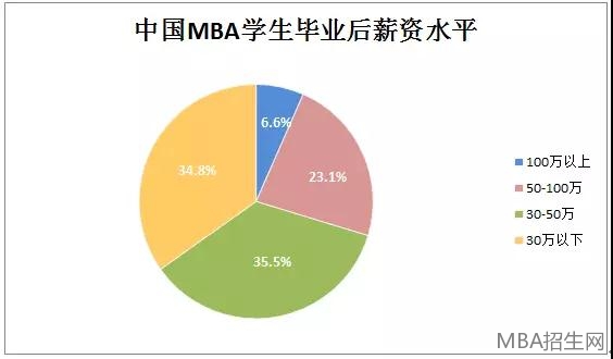 據不完全統計,中國MBA學生畢業后有6.6%的人年薪在100萬以上,23.1%的人年薪50萬到100萬,35.5%的人年薪在30萬到50萬,余下的34.8%的人年薪在30萬以下。近些年,受市場的影響,中國MBA畢業生漲幅高于歐美。