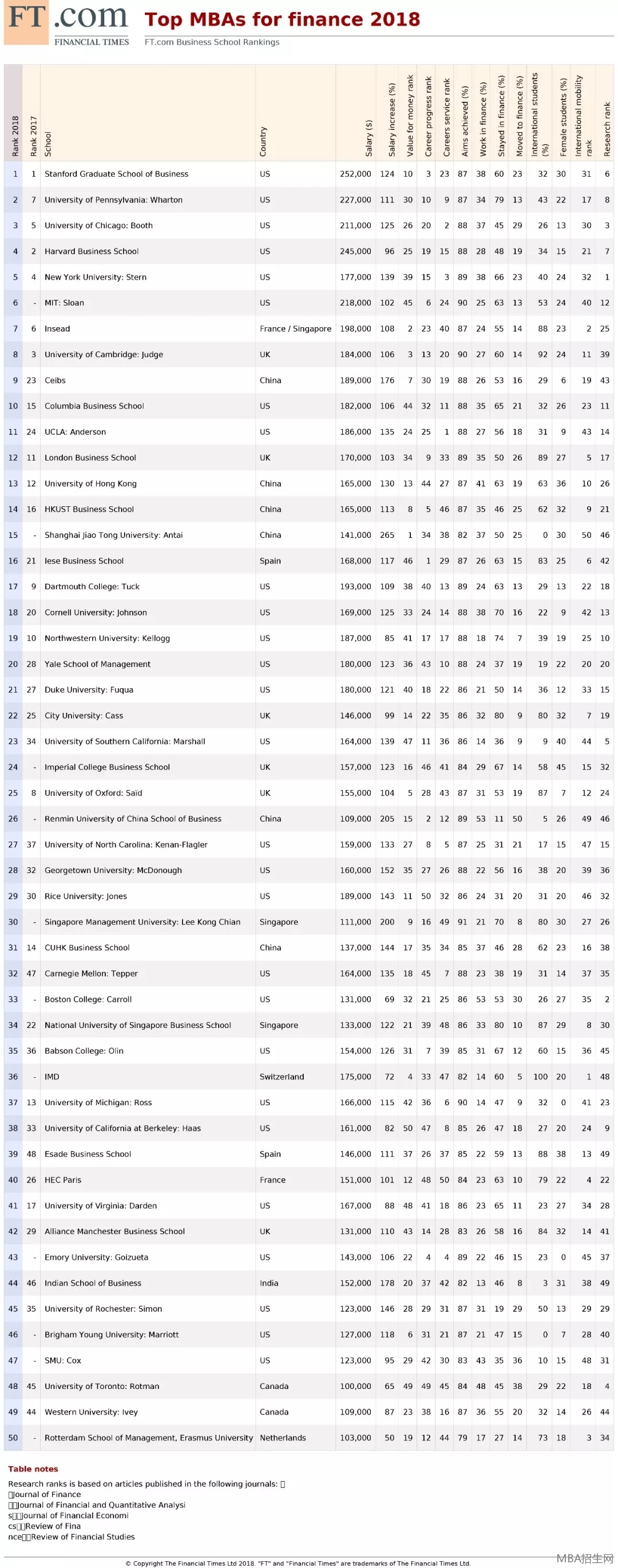 2018年度FT全球金融MBA排行榜完整榜單