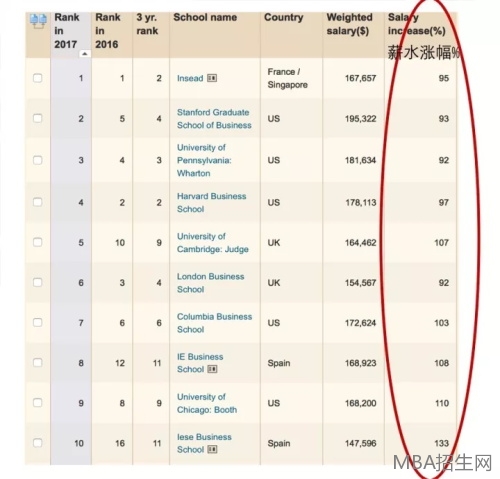 其中大家最關注的還是畢業起薪以及薪水漲幅這兩項指標,這也是每年申請MBA的候選人最關注的指標。2017年FT發布的2017全球MBA排名如下:
