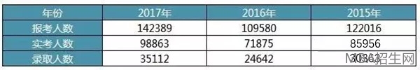 從近三年招錄人數分析,報考人數大致以2萬左右遞增,實考人數緊跟上升,錄取人數穩定在3萬人上下浮動。從長遠數據看,每隔2-3年錄取人數會有一次躍升。從報考趨勢可以看出,報考人數逐年上漲,MBA等管理類聯考報考項目熱度不減。